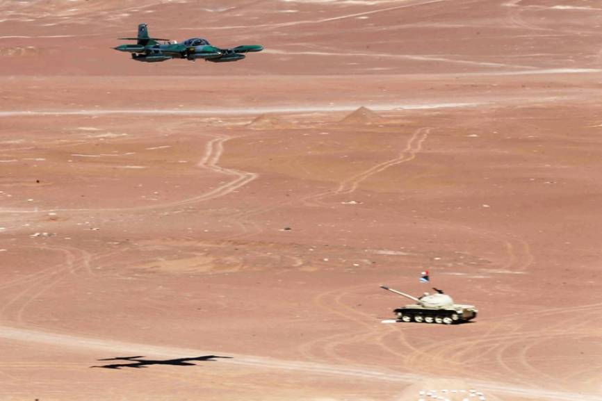 Tanques T-55 de la 6ª Brigada Blindada se aprestan a emprender la marcha bajo la cobertura de dos Helicópteros de Transporte y Combate Mi-171Sh Hip H.(Ministerio de Defensa del Perú)
