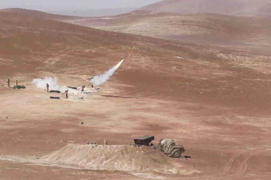Despliegue de Armas de Apoyo. Se aprecian ametralladoras FN MAG de 7.62x51 mm. y Lanzacohetes Alcotan 100 de 100 mm. y RPG-7V de 85 mm. Los Vehículos de Exploración son IVECO M-40E15 (4x4).(Ministerio de Defensa del Perú)