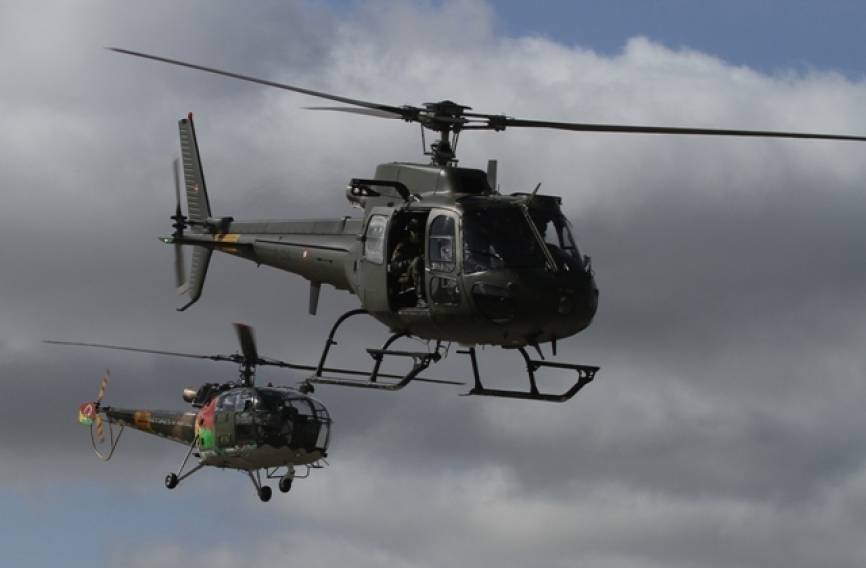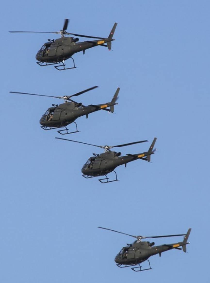 Tras una misión vuelven en formación los 4 helicópteros AS550 C2 “Fennec” que la Fuerza Aérea de Dinamarca desplazó a Beja, junto a 50 efectivos. (Julio Maiz, Copyright defensa.com)