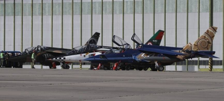 Tres de los vistosos “Alpha Jet A” de la 103ª Escuadra que realizan tareas de entrenamiento aéreo avanzado. Actualmente están en servicio sólo 6 de estos aparatos, de los cerca de 50 que en los años 90 cedió la Luftwaffe alemana a la FAP. (Julio Maiz, Cop