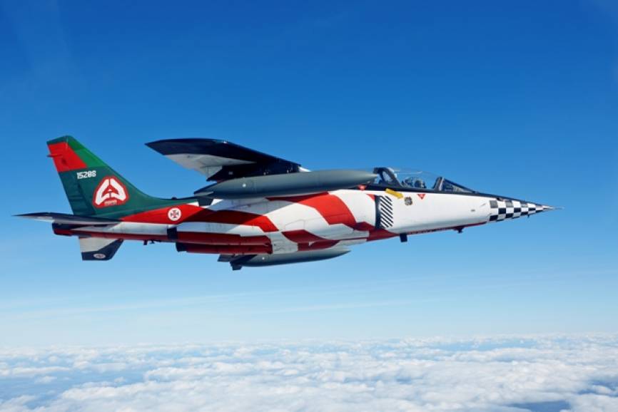 Bonita imagen en vuelo de uno de los “Alpha Jet A” de la FAP, modelo de avión de origen alemán que tiene base en Beja, instalación sede del RT15 (foto FAP).