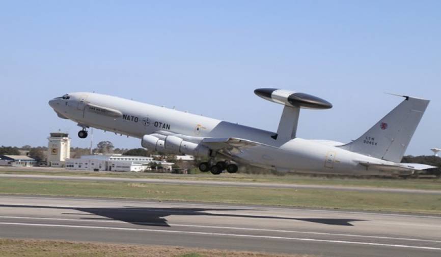 La OTAN desplazó a Beja uno de sus aviones de alerta y control Boeing E-3B AWACS, que vemos despegando, teniendo al fondo la torre de control. (Julio Maiz, Copyright defensa.com)