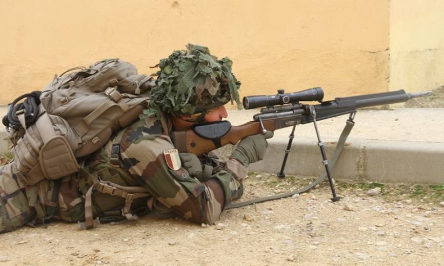 Un para galo apuntando su fusil de precisión FRF2, equipado con bípode y una mira óptica, que están siendo reemplazadas por los visores de última generación Sword Sniper. (Julio Maíz, copyright defensa.com)