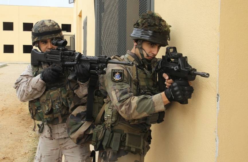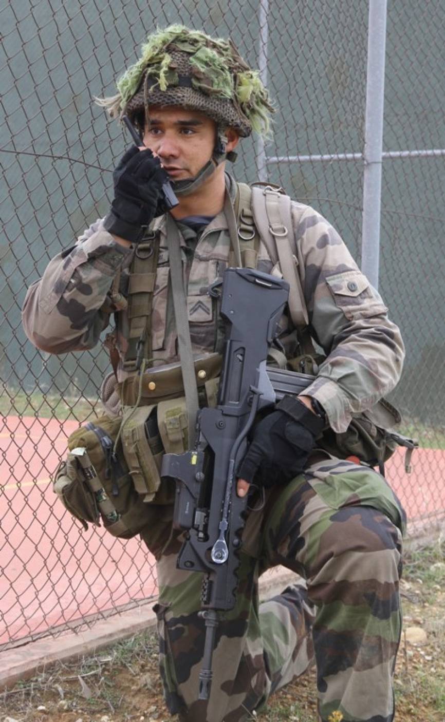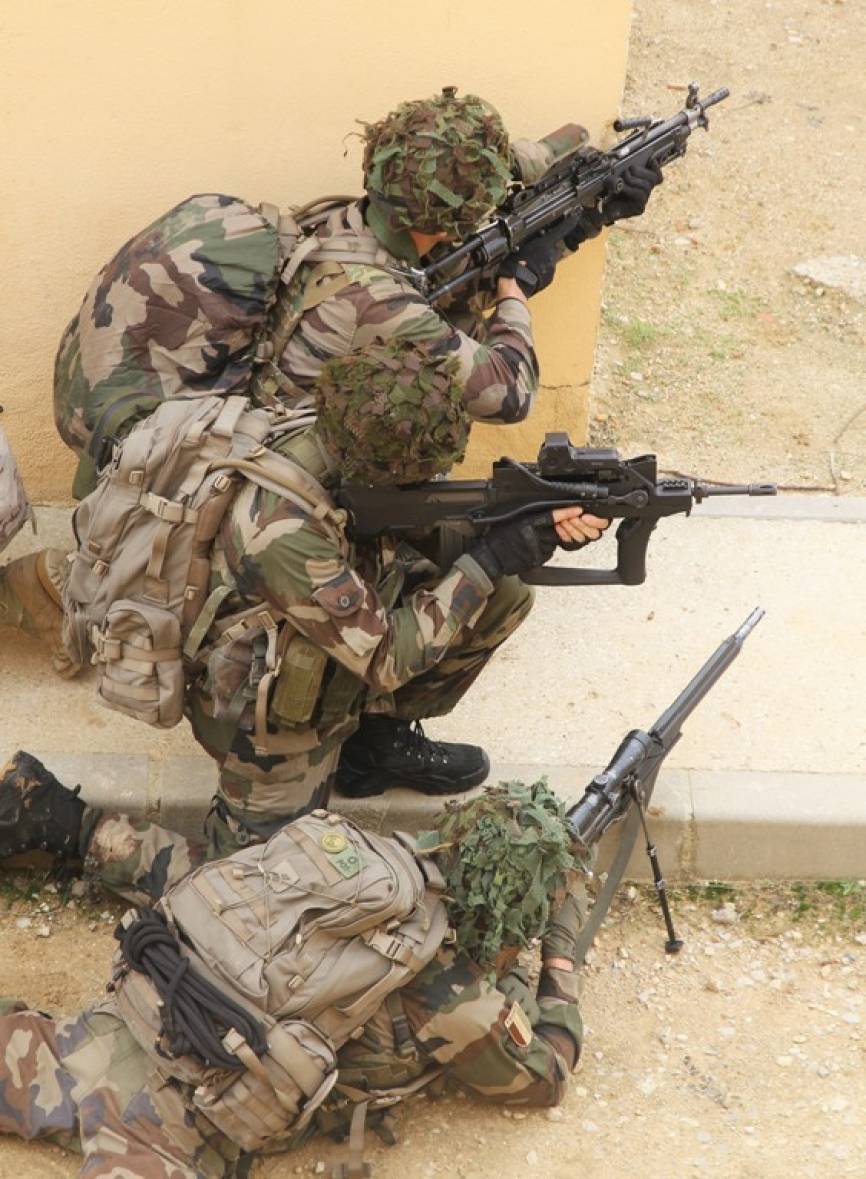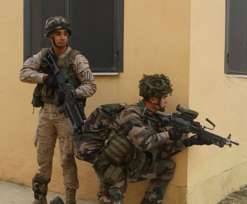 Un soldado galo, armado con una ametralladora ligera FN Herstal “Minimi”, en su versión denominada Para, es cubierto por un “paraca” de la II Bandera de la BRIPAC, que empuña su HK G-36K, dotado de un lanzagranadas de 40 m/m. (Julio Maíz, copyright defen