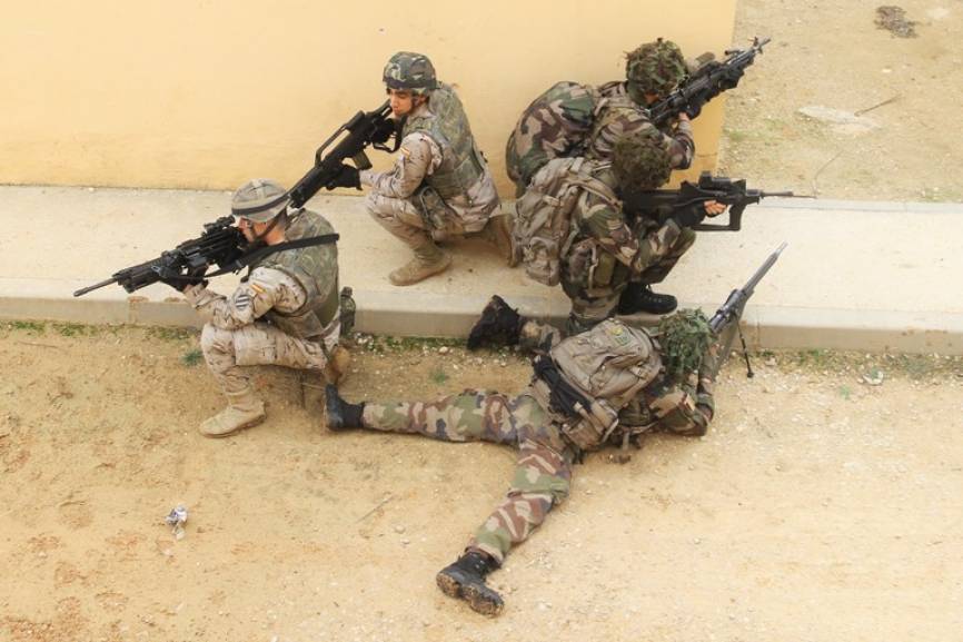Un suboficial de la II Bandera, en el centro agachado, da las últimas explicaciones a sus hombres antes de participar en un ejercicio de combate urbano a desarrollar. (Julio Maíz, copyright defensa.com)