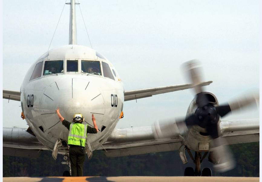 Jacksonville (Florida), 13 de febrero de 2006): Jesse Baron, asignado a los “Pro’s Nest” del Patrol Squadron Three Zero (VP-30) hace indicaciones a la tripulación de un P-3C durante los chequeos de puesta en marcha. Esa unidad es el Escuadrón de Remplazo