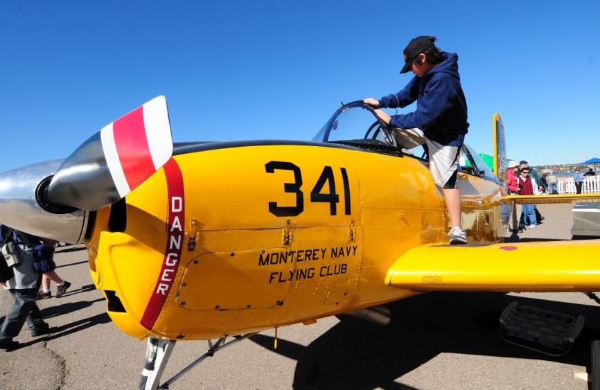 San Diego, 12 de febrero de 2011: un niño sube a la cabina de pilotaje de un T-34B “Mentor” en North Island (foto US Navy/Joseph M. Buliavac).