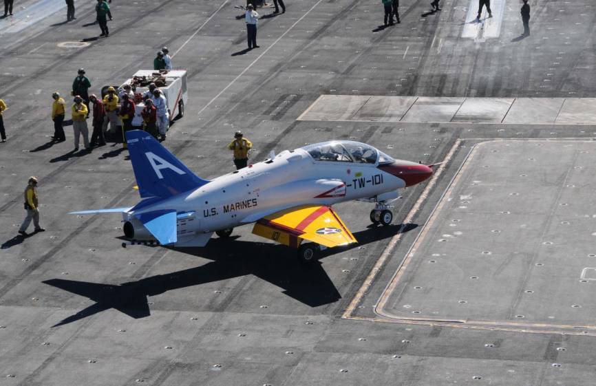 Océano Pacífico, 5 de noviembre de 2010: Un T-45C rueda en la cubierta de vuelo antes de lanzarse del USS “Nimitz” (CVN 68), pintado en conmemoración del Centenario. El portaaviones ha llevado a cabo cualificaciones del Ala de Entrenamiento frente a las c