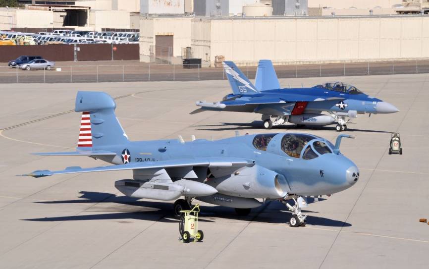 San Diego, 27 de enero de 2011: Un E/A-6B llega a la Naval Air Station North Island y se posiciona cerca de un E/A-18G, ambos asignados a los “Vikings” del Electronic Attack Squadron (VAQ) 129. Está pintado con esquema táctico propio de 1942 y ha particip