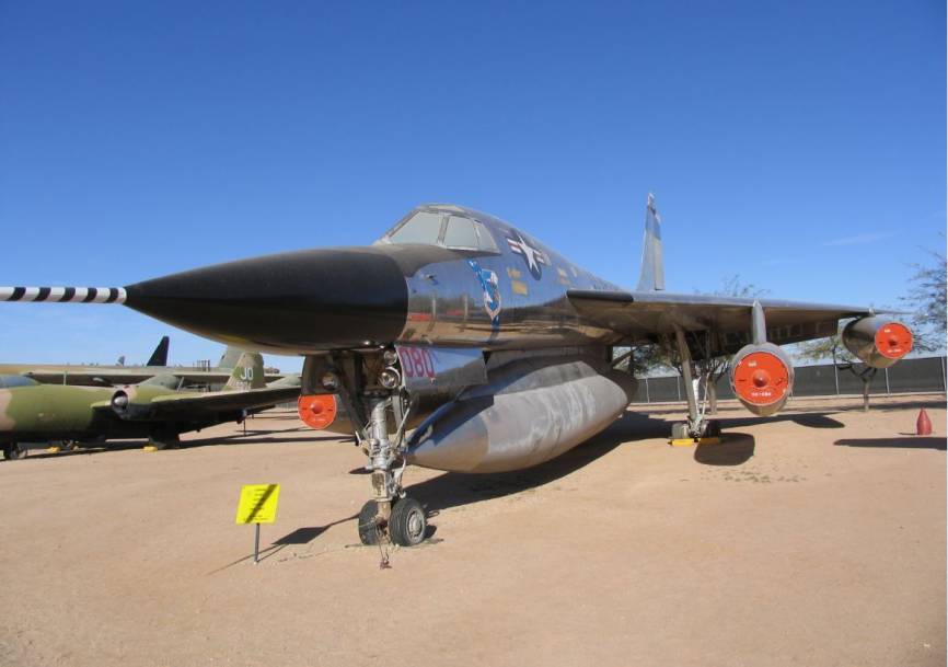 B-58A “Hustler”, encargado por el Strategic Air Command en la segunda mitad de los años cincuenta. Fue el primer bombardero en alcanzar la velocidad de Mach 2, pero tuvo una corta vida operativa, debido a los altos costes y al cambio de misiones estratég