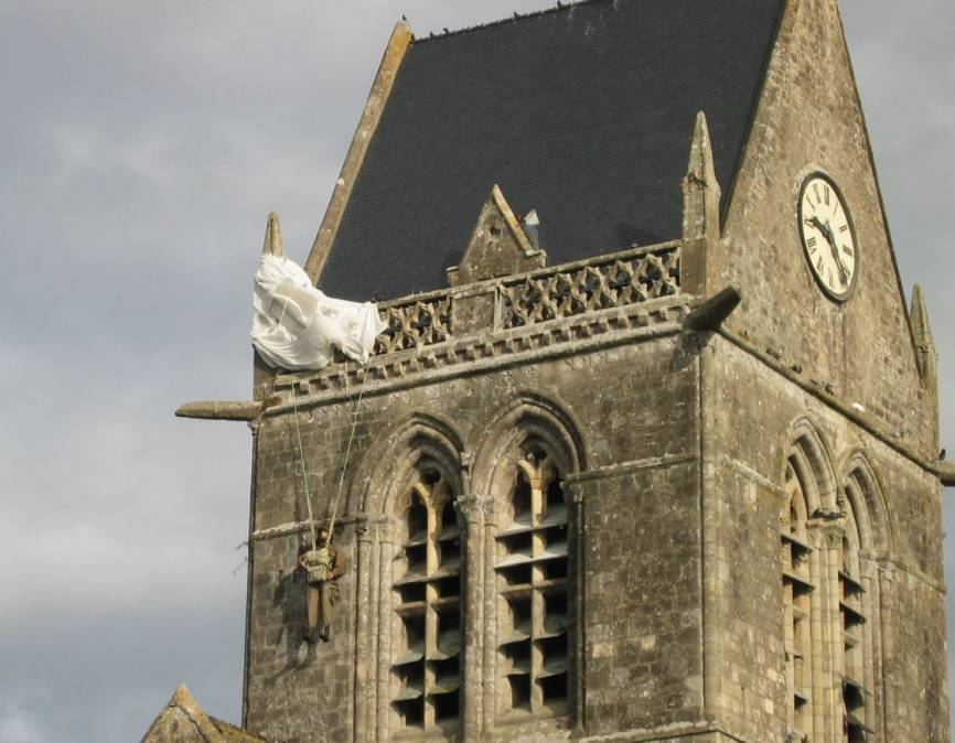 El paracaidista suspendido del campanario de la iglesia Sainte-Mère-Église, correspondiente en la realidad al soldado John Steel de la 82ª División, se ha convertido en una imagen significativa de la operación aerotransportada norteamericana en las horas