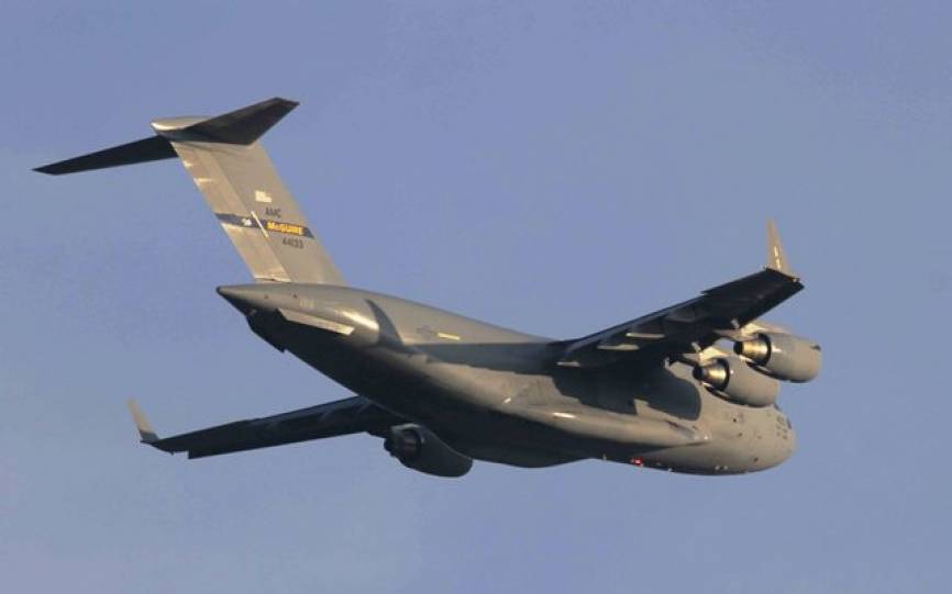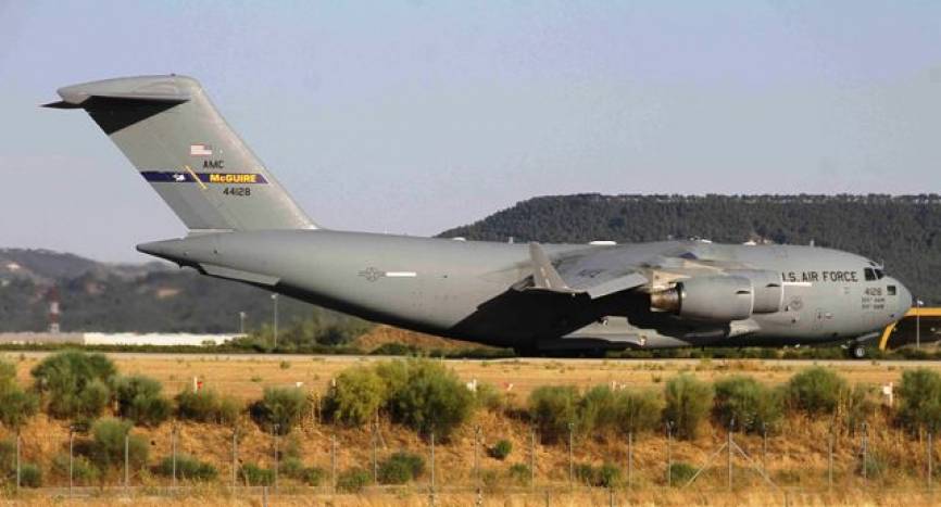 Tras la visita, varios transportes vinieron a España a replegar el material utilizado durante la visita, como este C-17A. Foto Julio Maíz.