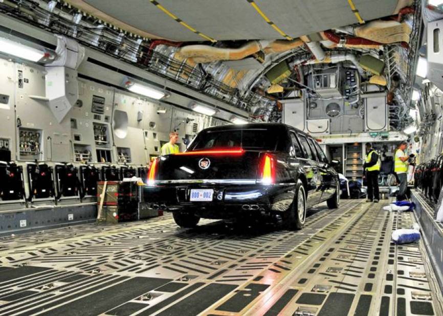 Uno de los Cadillac DTS modificados usados como Limusina presidencial, que son pre-posicionados a bordo de los transportes de la USAF, como en este C-17A. Foto USAF