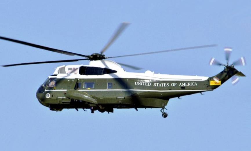 Un helicóptero VH-3D “Sea King”, más conocido como “Marine One”, uno de ellos se desplegó en Rota, desde donde hizo un vuelo de familiarización a Sevilla. Foto USMC.