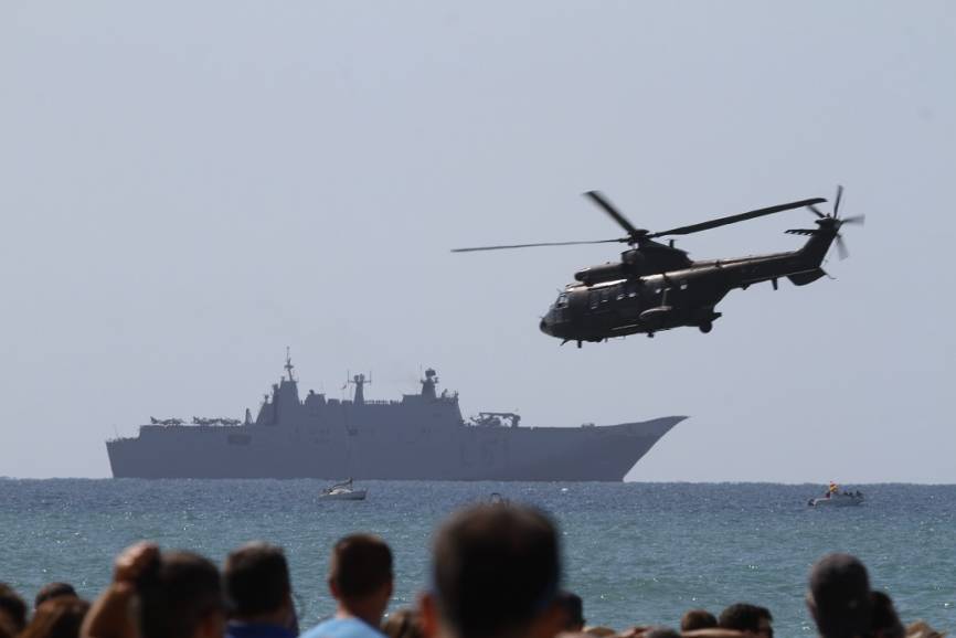 Un AB-212+ hace una pasada junto a la playa, al fondo se ve al Juan Carlos I.Julio Maíz Sanz / defensa.com