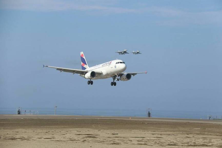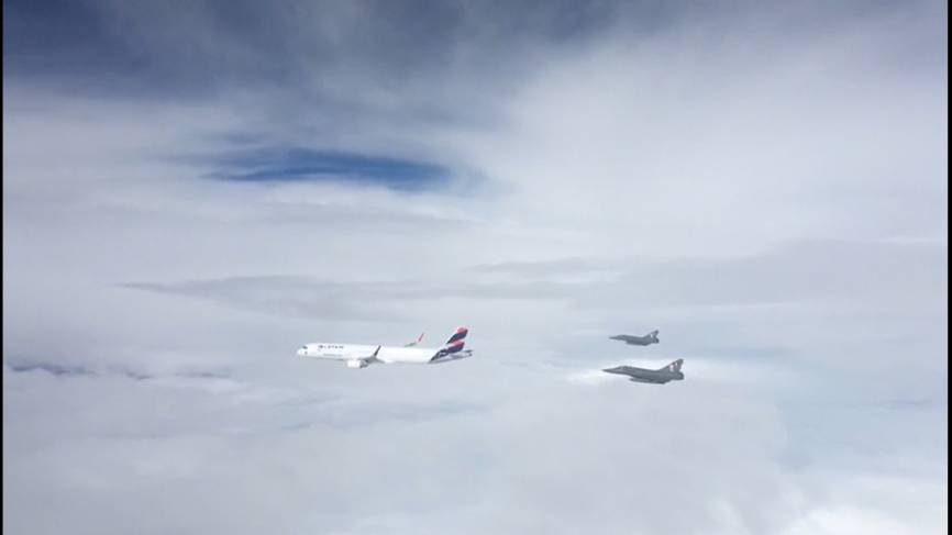 Airbus A321-211 de LATAM aterrizando en el Aeropuerto Internacional “Capitan FAP Carlos Martinez de Pinillos” (Trujillo) escoltado por dos Mirage 2000P.
