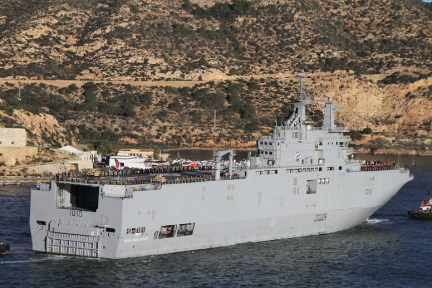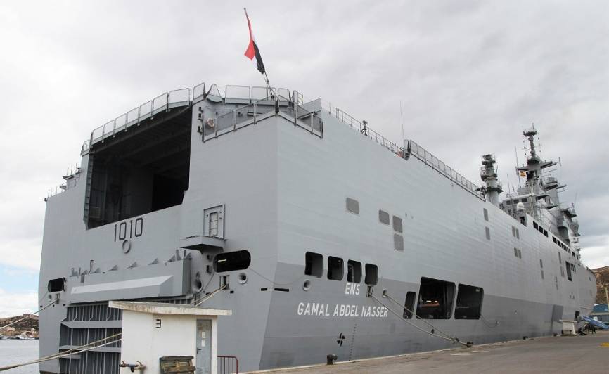 Vista de proa del “Gamal Abdel Nasser”, que en principio iba servir en la Armada de Rusia como “Vladivostok”, fue adquirido por Egipto a Francia en 2016.