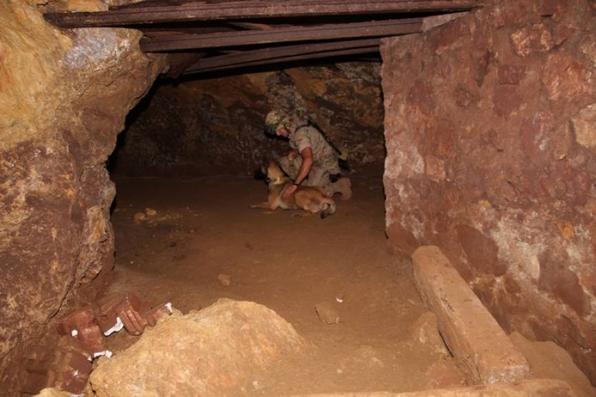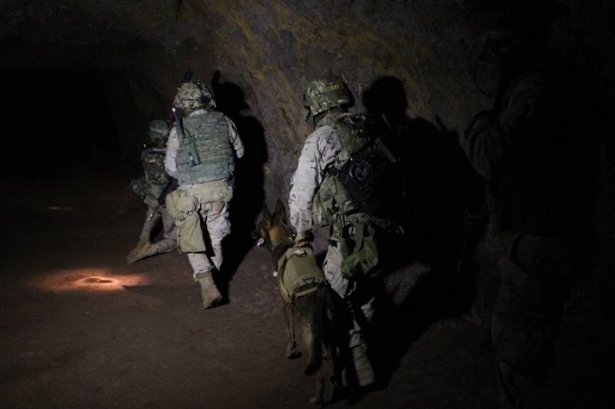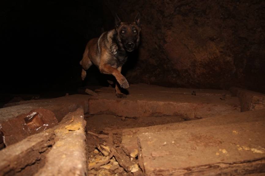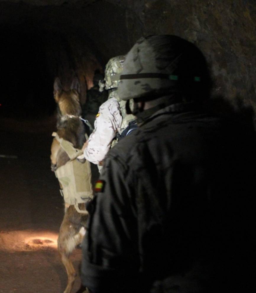Un perro de ataque avanza junto al personal de la UCAS en el interior de una red de galerías subterráneas