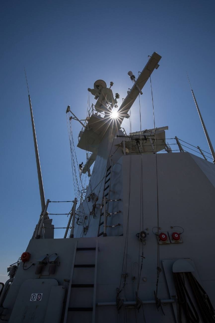 Vista parcial del Puente de mando y del cañón Oto Melara con la escotilla abierta.