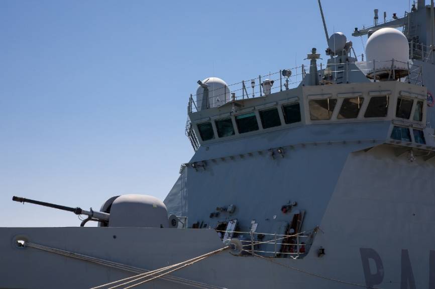 Vista frontal de la superestructura y la pieza de artillería principal OTO-Melara 76/62 mm Compatto.