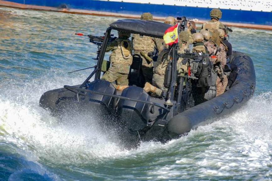 Una de las lanchas semirrígidas del Mando de Operaciones Especiales (MOE) navegando a toda velocidad para Guadalquivir.