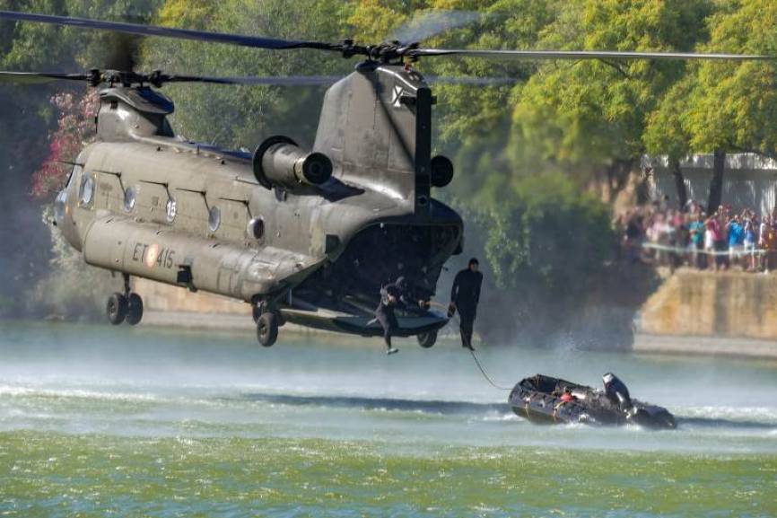 El Chinook lanzando una lancha de las fuerzas especiales al Río Guadalquivir.