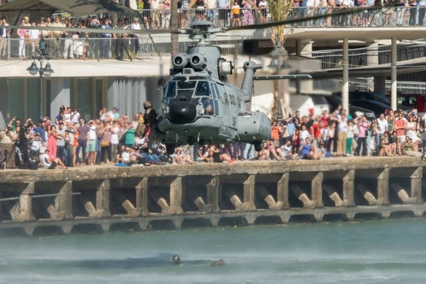 El Ejército del Aire no podía faltar, en la imagen uno de sus Airbus Helicopters AS332B desde el que se lanzan al río las fuerzas especiales de la institución, la EZAPAC.