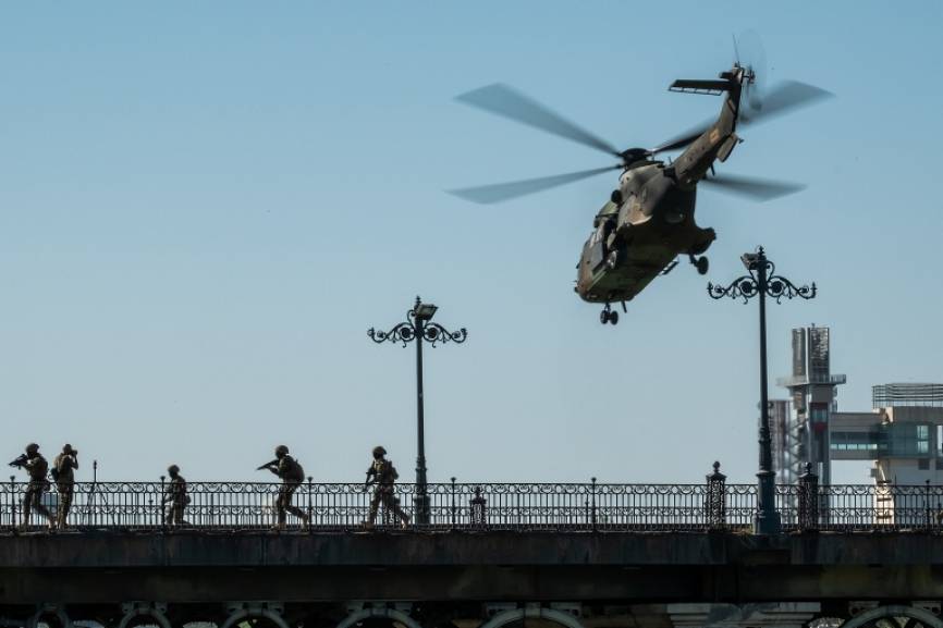 Un helicóptero de transporte táctico Airbus Helicopters AS532UL Cougar de las FAMET, dejo un grupo de miembros del MOE en el puente de Isabel II.