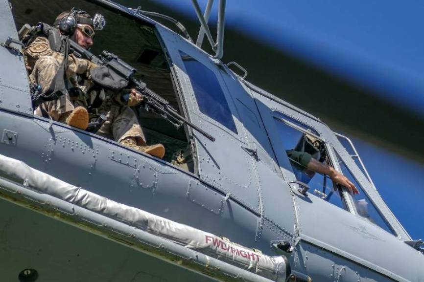Un infante de Marina apoya desde el helicóptero AB-212 con su fusil de asalto HK-417 el desarrollo del “Asalto”.