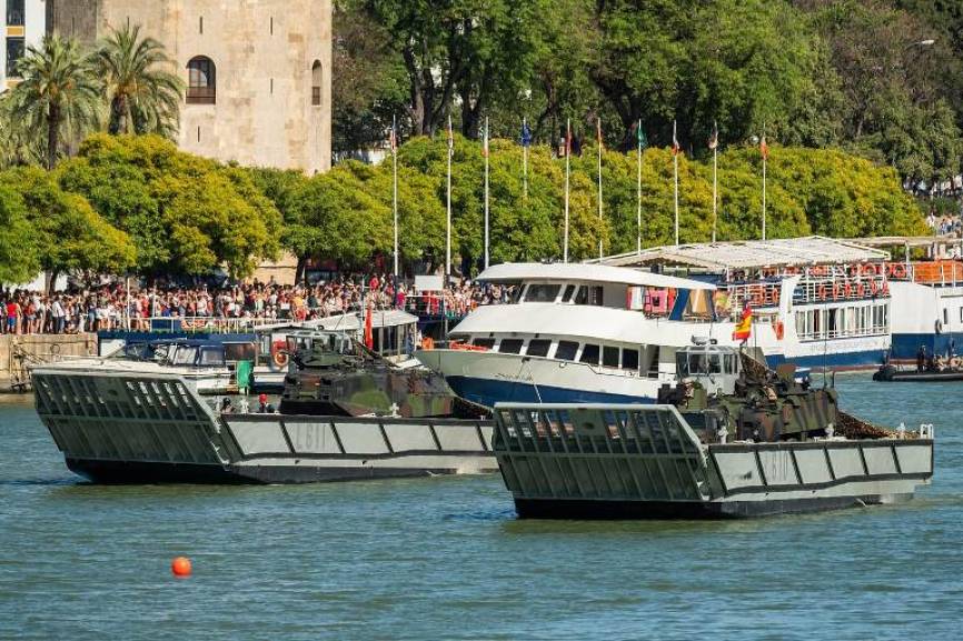 Dos de las lanchas de desembarco LCM-1E de la Armada llegaron a la zona de la exhibición, cargada con infantes de Marina y sus vehículos.