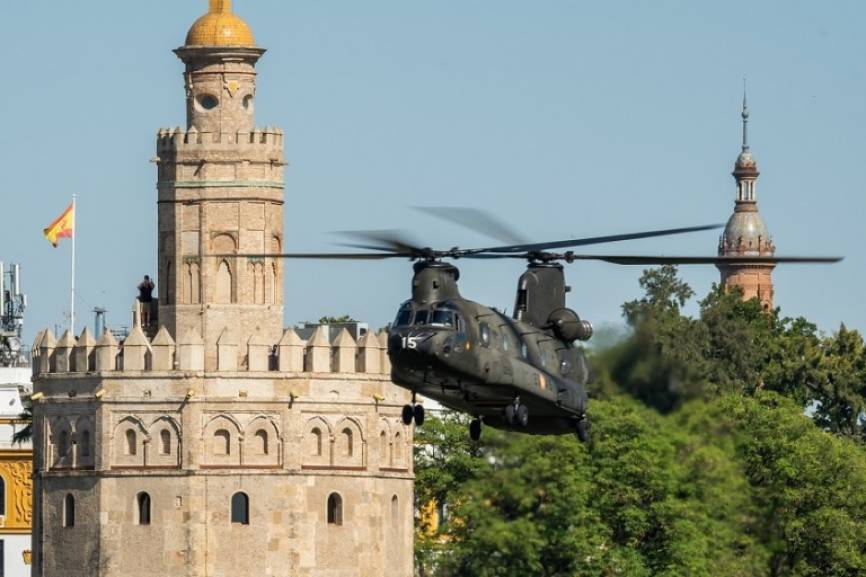 Un CH-47D llega al escenario de la exhibición, detrás se puede ver la sevillana Torre del Oro.