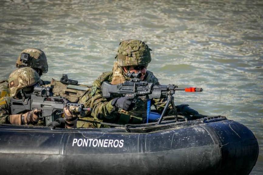 Primer plano de un miembro del Regimiento de Pontoneros y Especialidades de Ingenieros (RPEI) nº12, que empuña una ametralladora MG4.