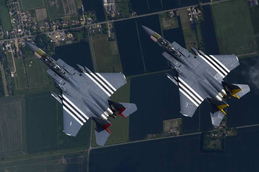 Fantástica imagen en la que se aprecian dos F-15E, con las bandas de invasión, volando en formación.