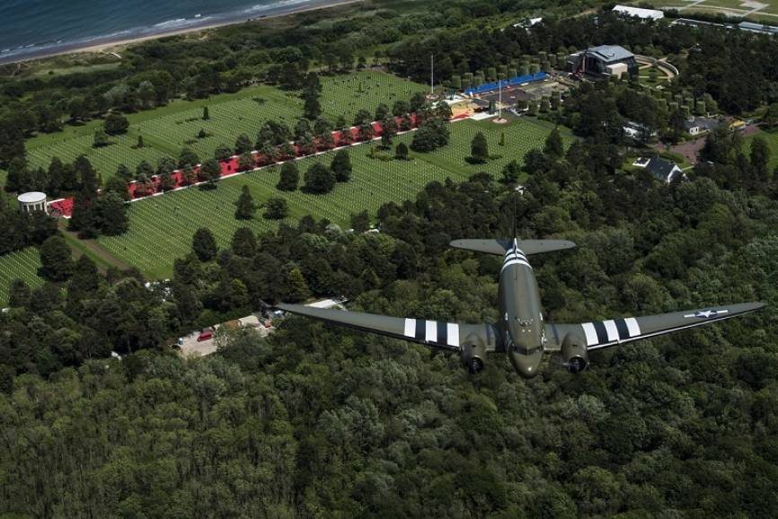 Un histórico C-47 sobrevuela el cementerio de Normandía, sito junto la playa “Omaha”, donde están enterrados miles de combatientes de los Estados Unidos.