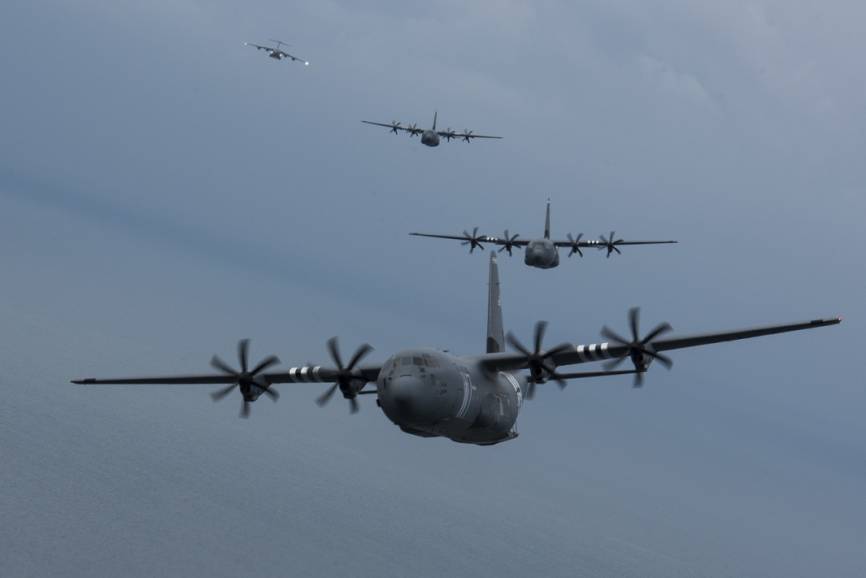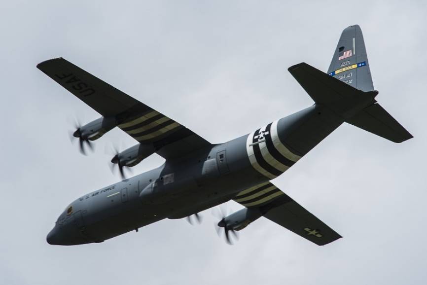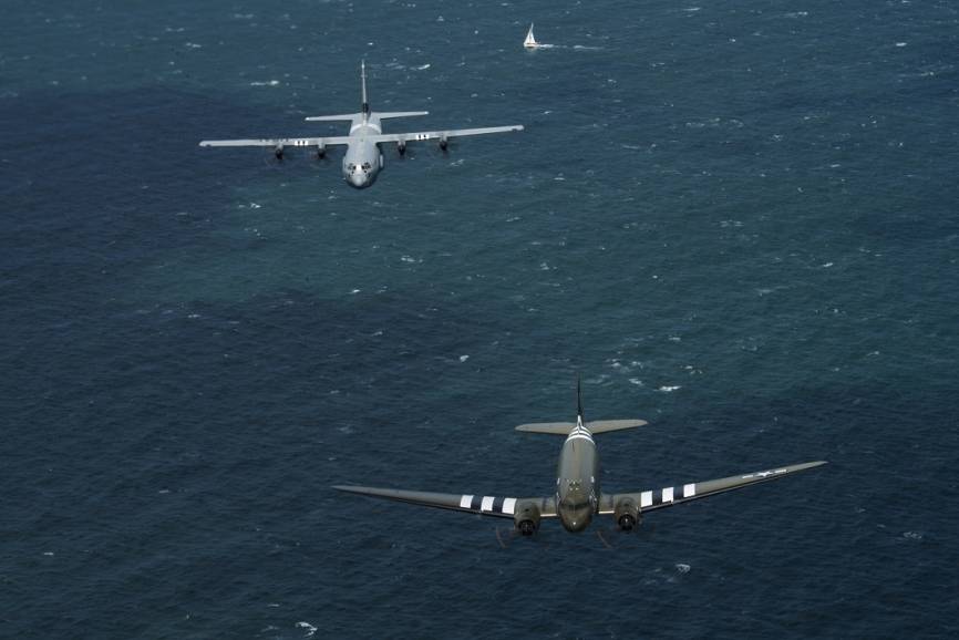 Una curiosa formación, de un C-47 y (detrás) un C-130J “Super Hercules”, el pasado y presente del transporte táctico de la USAF en una sola imagen.
