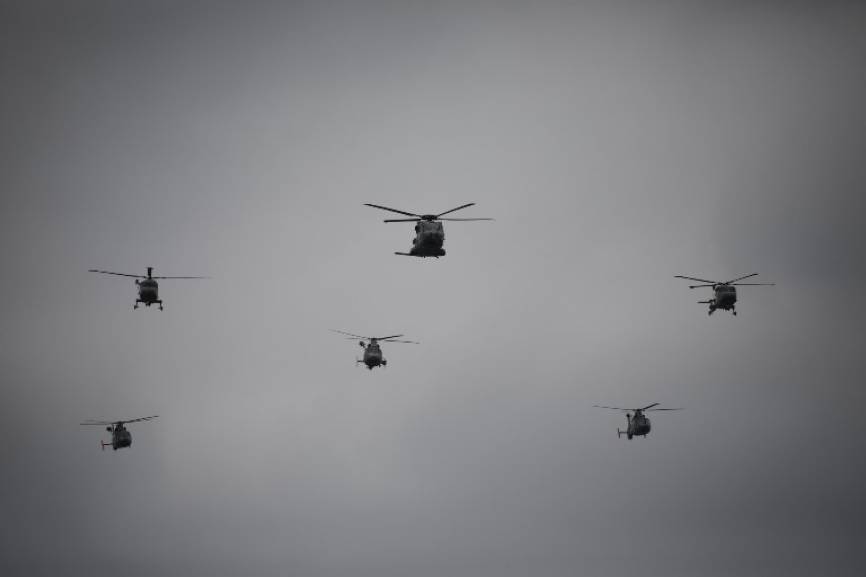 En el desfile aéreo participaron dos NH90 de las FAMET, aunque el de la imagen es uno de la Marine Nationale encabezando la formación de la institución, en la que no había “Tigre”. (foto: MDE España)