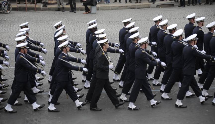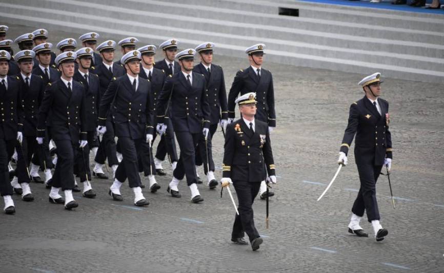 También por parte de la Armada han intervenido dos guardiamarinas de la Escuela Naval Militar de Marín (Pontevedra), (no llevan las polainas blancas) la cual mantiene un programa de intercambio de alumnos con la École Navale francesa. (foto: MDE España)