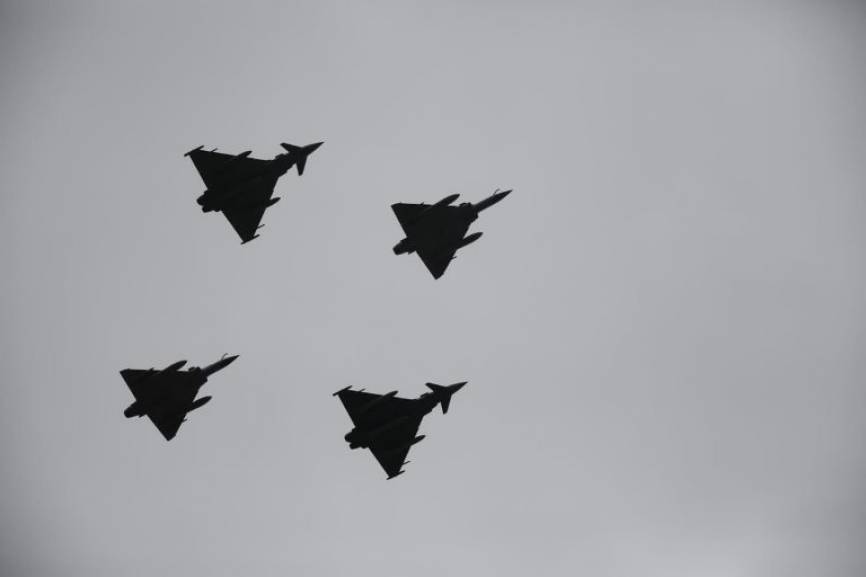 Un Eurofighter español, arriba a la izquierda, pasando en formación con otro de la RAF, y dos Mirage 2000-5F franceses, y no “Rafale” como se está publicando. (foto: MDE España)