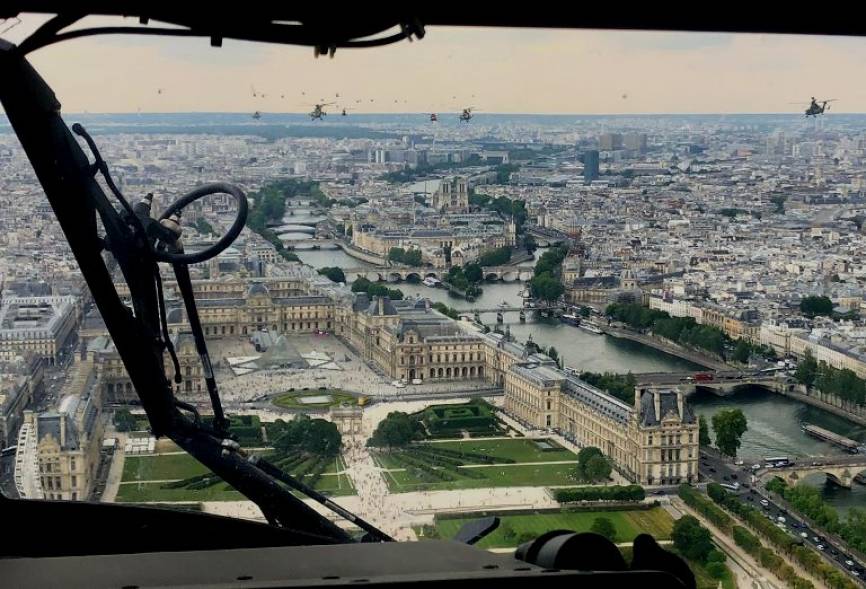 Vista del desfile aéreo, justo cuando pasa sobre el Louvre, desde uno de los NH90 de las FAMET, que participo en la parada. (foto: EMAD)