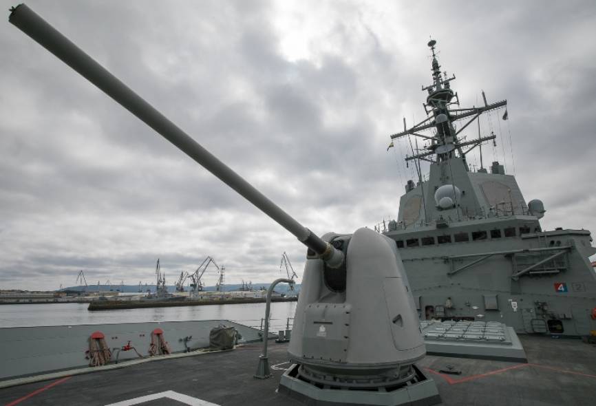 En primer plano "Rayo", nombre puesto por la tripulación, cañón tipo Mk-45 de cinco pulgadas con una cadencia de disparo de 20 proyectiles por minuto y un alcance efectivo de 23 km.