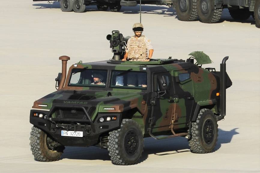 Uno de los VAMTAC destinados a portar y lanzar el mísil anticarro “Spike”, sito en el soporte que vemos en la parte derecha de la torre.