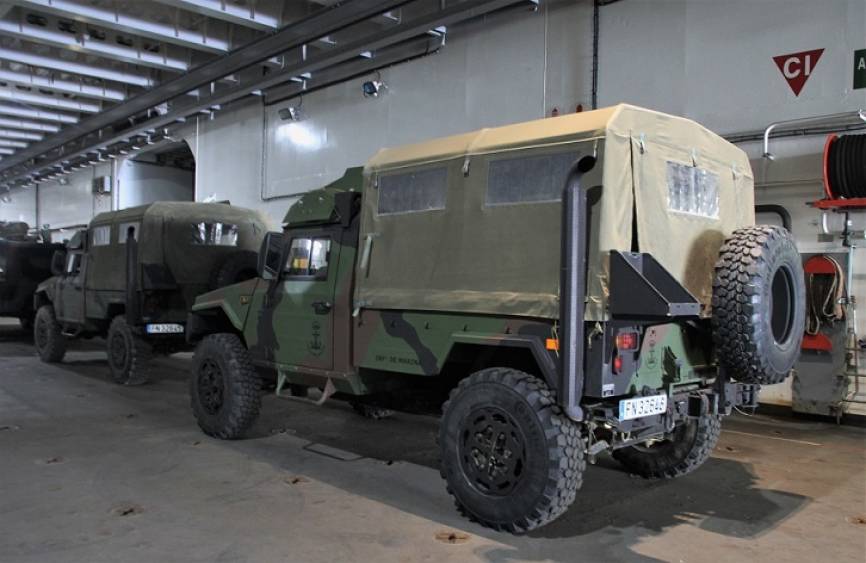 Dos de los ST5 del TEAR en su versión Pick Up con la lona colocada, esperan su trincado en uno de los garajes del “Juan Carlos I”, antes de zarpar.
