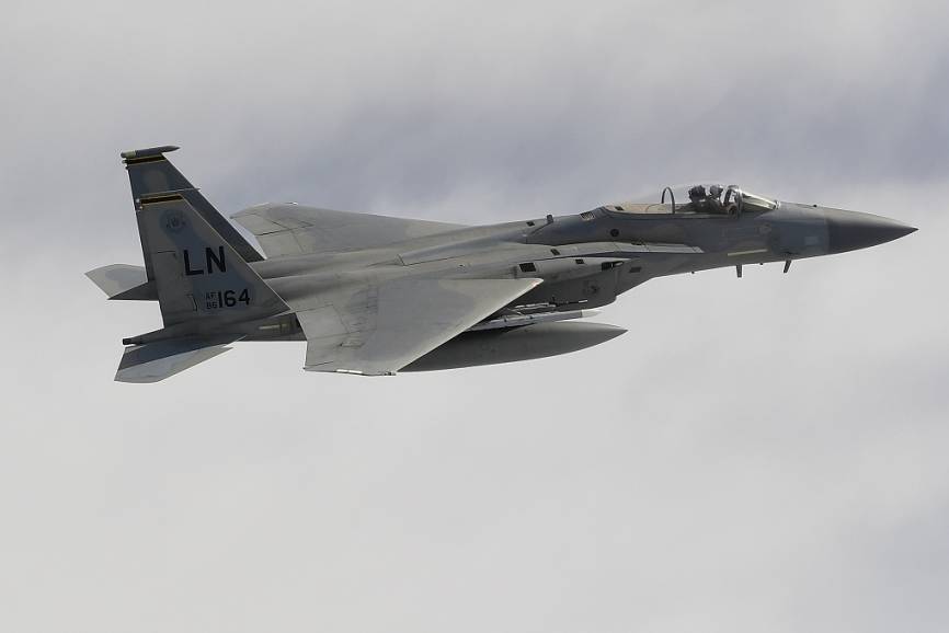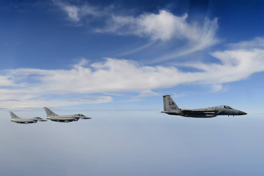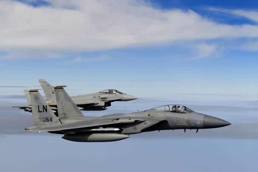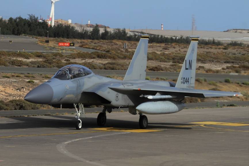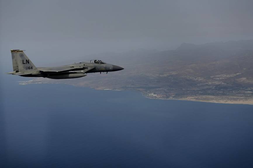 Desde la base aérea de RAF (Royal Air Force)-Lakenheath, sita en Inglaterra, la USAFE desplazó once F-15C (en la imagen) y un biplaza F-15D desde el que se realizaron las fotos.