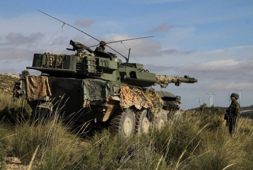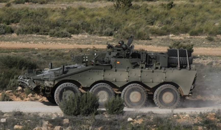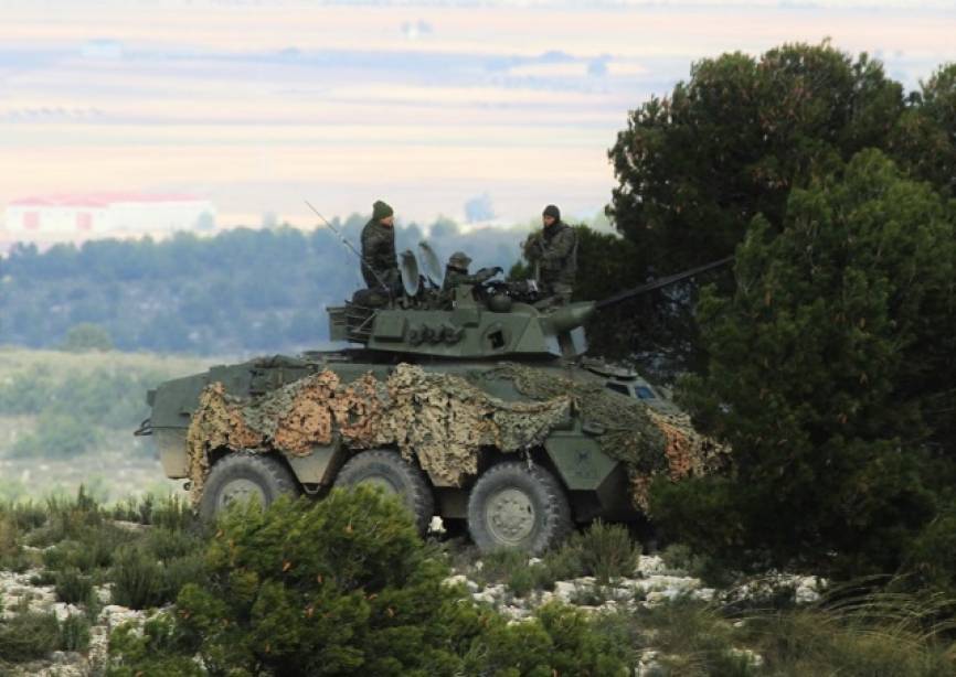 Uno de los Vehículo de Exploración de Caballería (VEC) del “Sagunto”, situado discretamente entre pinos en lo alto de una montaña.