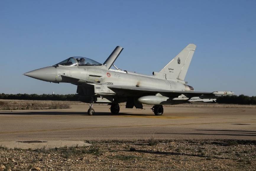 Un Eurofighter italiano en concreto del 4º Stormo, como denota el numeral y la insignia del “Cavallino rampante” de la cola, la insignia del as transalpino de la Primera Guerra Mundial Francesco Baracca.