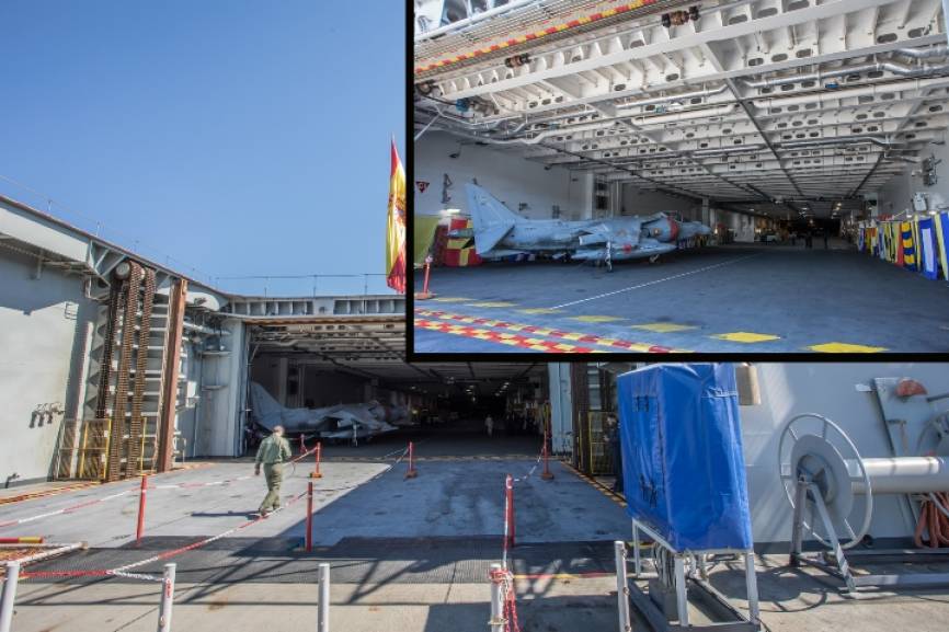 Un buque con un desplazamiento de 26000 Tons. y una dotacion de 295 hombres y mujeres. En la imagen, uno de los elevadores de acceso al garaje de carga ligera.