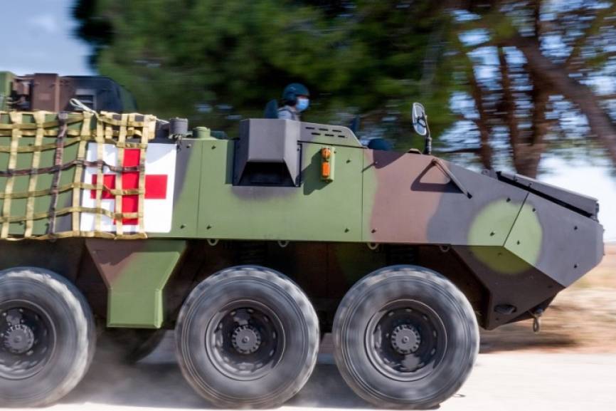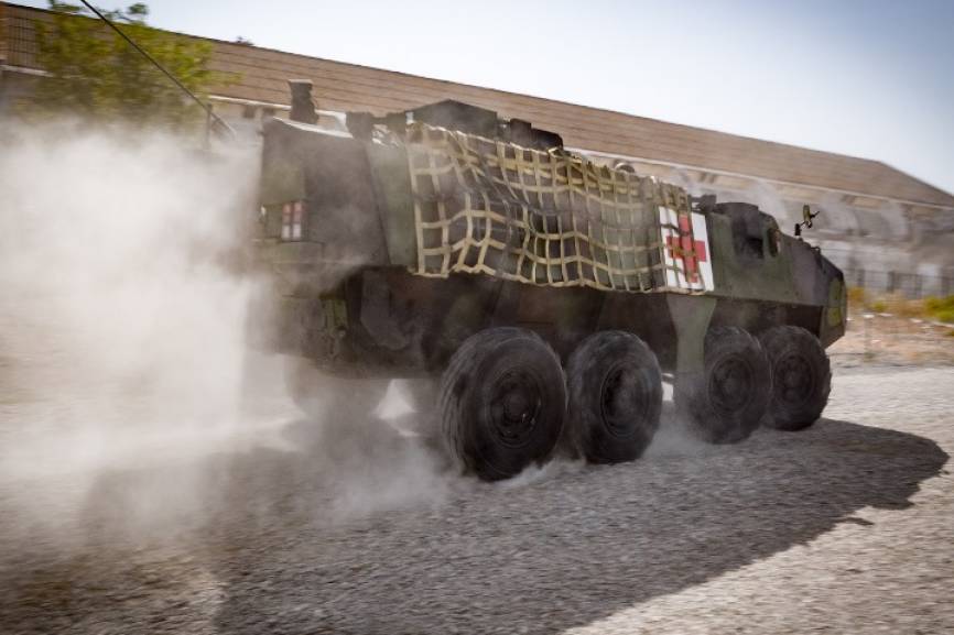 El “Piranha” IIIC versión ambulancia da una importante capacidad de evacuación sanitaria en zona de combate al TEAR. (foto José Antonio Almarza)