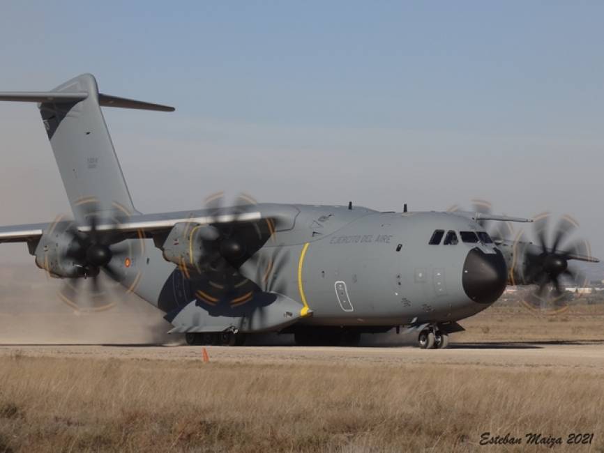 El A400M del Ala 31 en corta final para realizar una toma de máximo esfuerzo en la pista de tierra del aeródromo de Ablitas bajo la atenta mirada de un miembro del CCT (Combat Control Team) de la Fuerza Aérea Polaca.