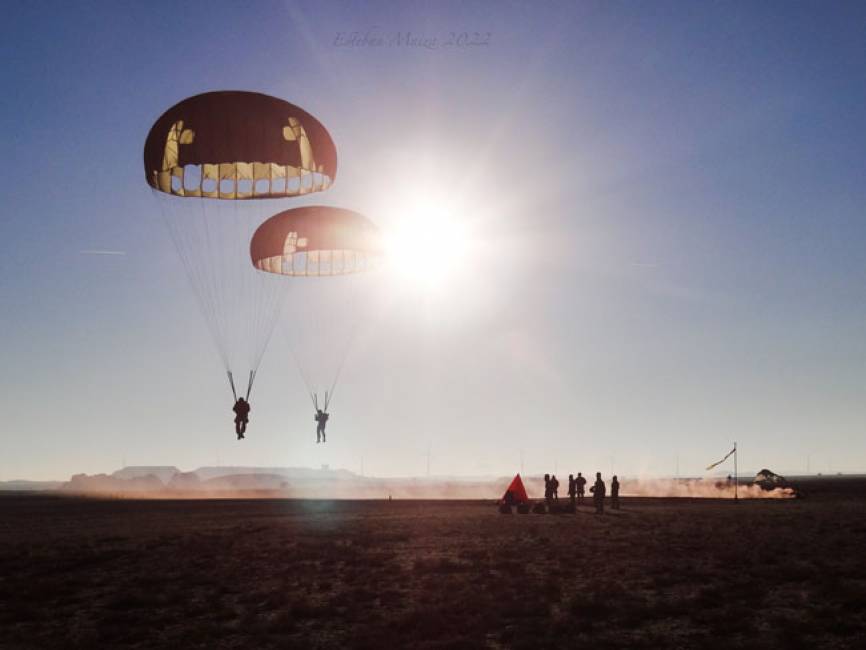 Dos paracaidistas del EADA caen lentamente sobre el punto de impacto tras haber saltado desde un C-295 en modalidad automática.