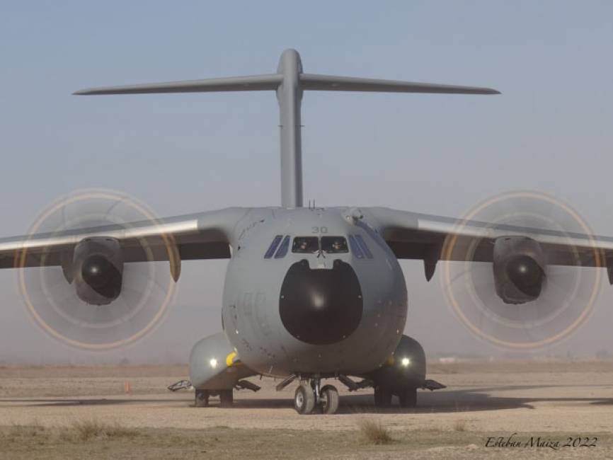 Un A400M del Ala 31 levantando una nube de polvo con la potencia de sus cuatro motores mientras se dirige a la cabecera de la pista del aeródromo de Ablitas.